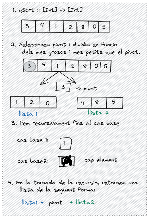 Aquestes funcions estan relacionades amb l’algorisme de QuickSort. La funció divideNconquer implementa la lògica de dividir i conquerir, utilitzant una funció base per a la condició de parada, una funció divide per a la divisió de la llista i una funció conquer per a la combinació dels resultats de les crides recursives. En aquest cas, es tracta de l’ordre de les funcions i l’ús d’una llista d’enters.